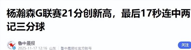 鲁中晨报(杨瀚森G联赛21分创新高,最后17秒连中两记三分球2025.11.17)